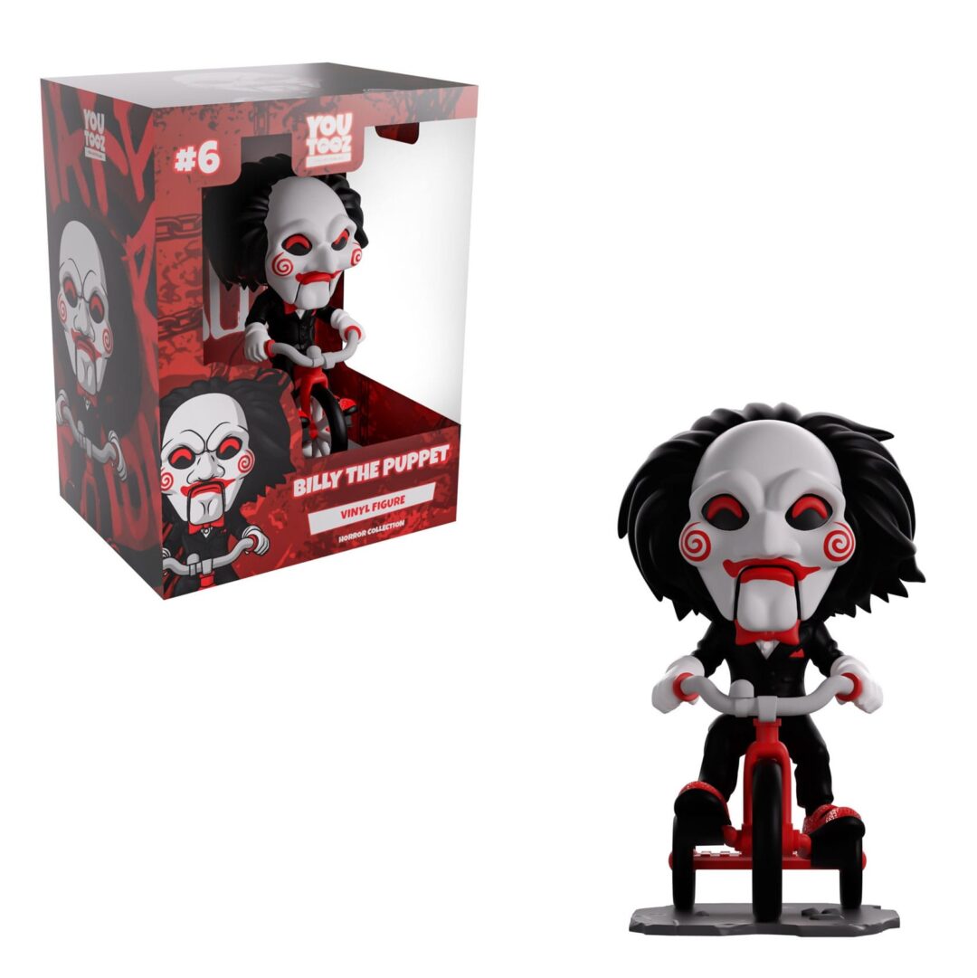 Τώρα αυτό είναι ένα παιχνίδι που σίγουρα θέλουμε να παίξουμε καθώς ο Billy the Puppet κάνει το ντεμπούτο του στο Youtooz! Έτοιμος να σας προσφέρει την απόλυτη πρόκληση και να οδηγεί πάνω σε ένα έντονο κόκκινο και γκρι τρίκυκλο ύψους 5,2 ιντσών με τα χέρια του με λευκά γάντια να πιάνουν το τιμόνι και ένα αστραφτερό κόκκινο παπούτσι σε κάθε πεντάλ, τα μακριά μαύρα μαλλιά του ανασύρονται από μια λευκή μάσκα. φωτεινές κόκκινες κόρες λάμπουν κάτω από ένα παχύ φρύδι. Με σπείρες σε κάθε μάγουλο και τις γραμμές του στόματος του μαριονέτα σκαλισμένες γύρω από έντονα κόκκινα χείλη, φοράει ένα λείο μαύρο κοστούμι πάνω από ένα λευκό πουκάμισο και κόκκινο παπιγιόν. Το εξωτερικό της συσκευασίας του είναι μαύρο και κόκκινο του αίματος με ένα τρομακτικό γουρούνι που καλύπτεται να κοιτάζει προς τα έξω. Το εσωτερικό είναι καλυμμένο με ένα κηλιδωτό κόκκινο του αίματος με μια σειρά από αλυσίδες να διατρέχουν, στη συνέχεια συνεχίζουν στο προστατευτικό μανίκι, όπου φαίνεται η φιγούρα του μέσα από το μεγάλο διαφανές παράθυρο στο μπροστινό μέρος της συσκευασίας. Αυτό το συλλεκτικό διαθέτει ματ, ανάγλυφο, προστατευτικό εξωτερικό περίβλημα και πλαστικό προστατευτικό προσαρμοσμένου μεγέθους για μέγιστη προστασία κατά την αποστολή.