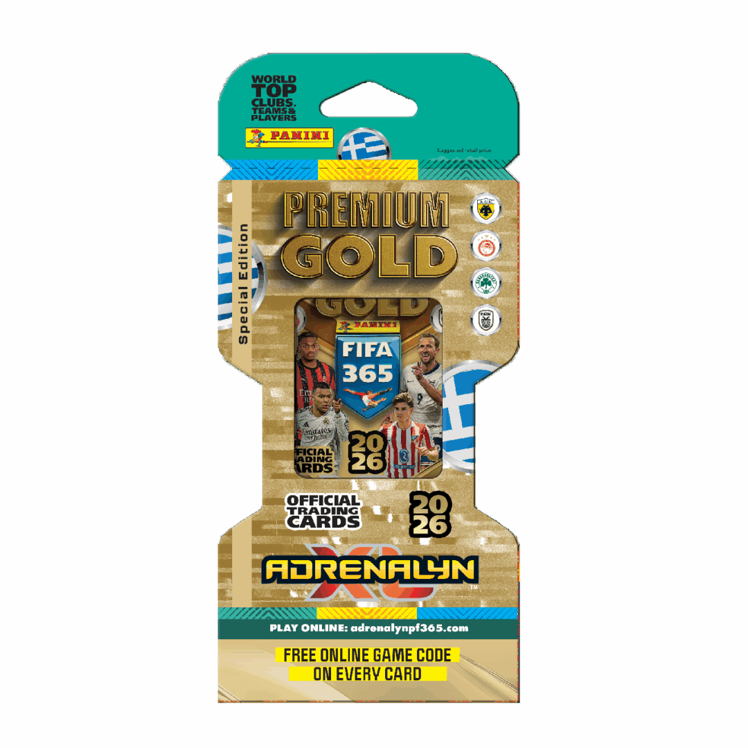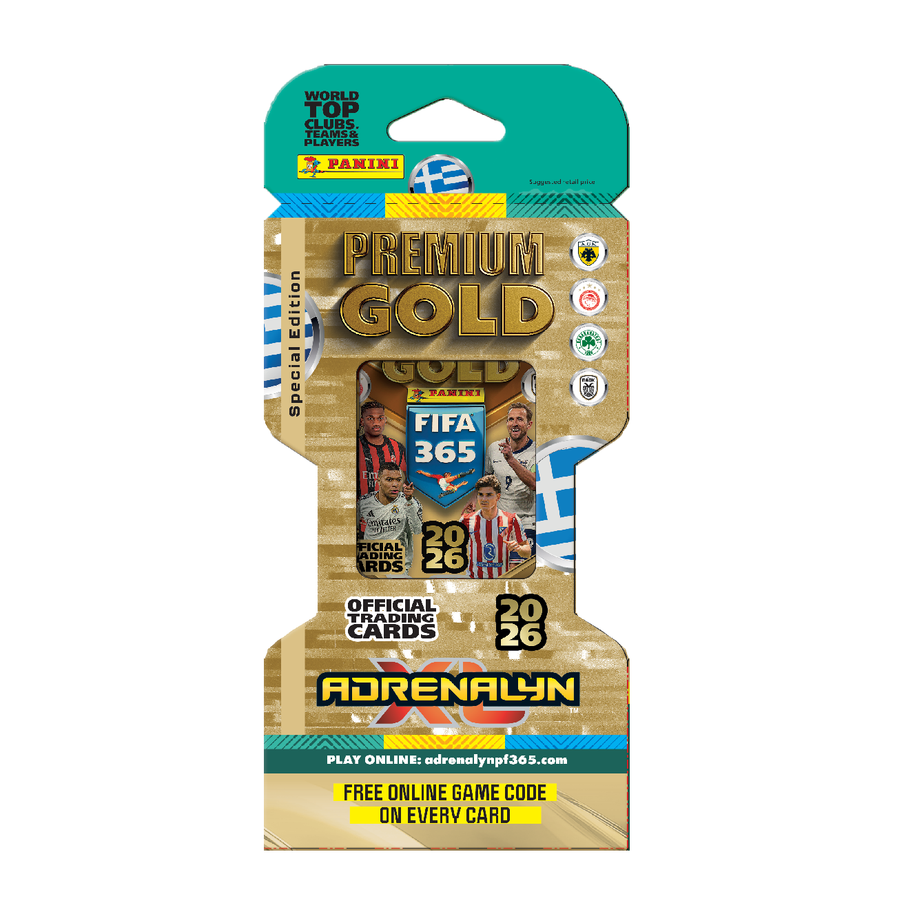 Fifa 365 Adrenalin XL 2026 Premium Gold Blister Panini – Το απόλυτο premium πακέτο για συλλέκτες! Περιλαμβάνει 1 premium φακελάκι, 3 premium gold limited edition κάρτες και 1 limited edition online κάρτα. Συνολικά 14 κάρτες σε μία ενισχυμένη συσκευασία που ξεχωρίζει.